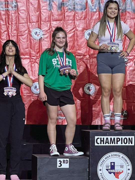 Freshman Jaide Jones finished off her Freshman year in style by earning a bronze medal at the state powerlifting meet, at Bert Ogden Arena in Edinburg, on March 13, 2025. Jones set a personal record for total weight at 670 lbs. Her results at the meet were Squat 275 lbs, Bench 135 lbs, and Deadlift 260 lbs. Jones described her experience, “The THSWPA state meet was exhilarating, and I cannot wait to do it again! My goal at this meet was at least 4th place, and I crushed it!”