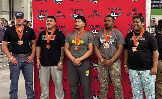 Yorktown senior Johnathan Guerrero brought home a state championship as he won the 132 pound weight class at the State Powerlifting Championship in Abilene, Texas on March 22, 2025. Guerrero won in dominating fashion, as he broke the state record in squat (555 pounds) and tied the deadlift record (500 pounds). Those lifts, combined with his bench press of 310 pounds, totalled 1365 pounds lifted, also a state record.