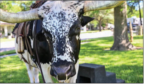 Trail Boss Mrs. Candy Glidden sits on top of Tex the longhorn.