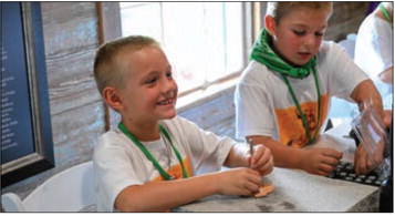 From left, Cason Davis and Blevins Rampley learn how to decorate leather ornaments with traditional hand tools.