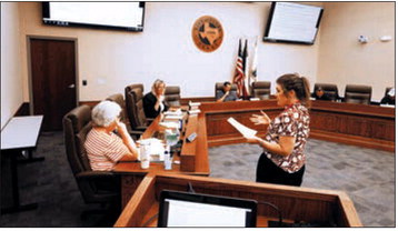Cuero Development Corporation Executive Director Maggie Cromeens brainstorms commercial land options with the CDC board during their meeting on June 17. (Staff Photo)