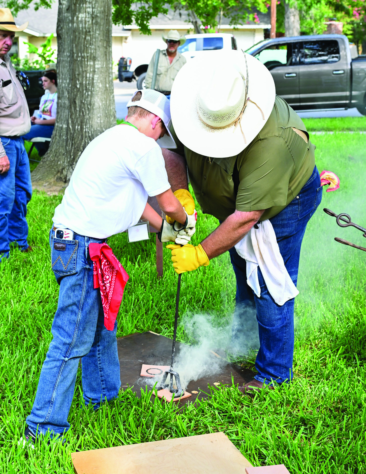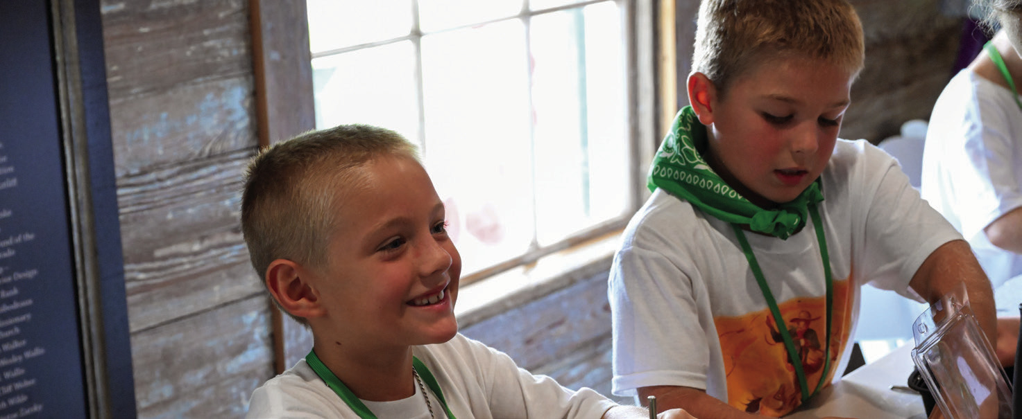 From left, Cason Davis and Blevins Rampley learn how to decorate leather ornaments with traditional hand tools.