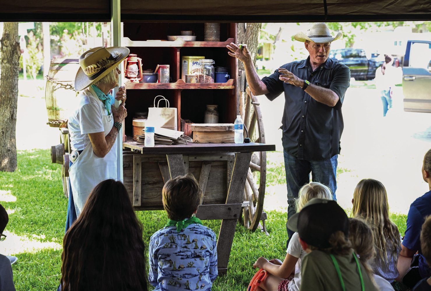 Campers enjoy trail snacks such as jerky and pickles near the chuckwagon, while the cook, or 'Cookie' listens to Brian Black perform cowboy songs on harmonica.
