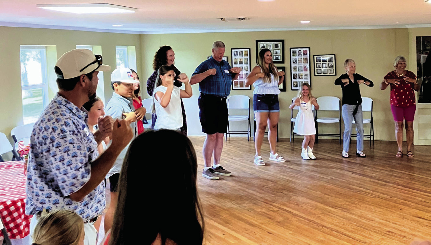 Baros family members perform the Chicken Dance at the end of their reunion at the American Legion Hall in Westhoff. (Contributed Photo)