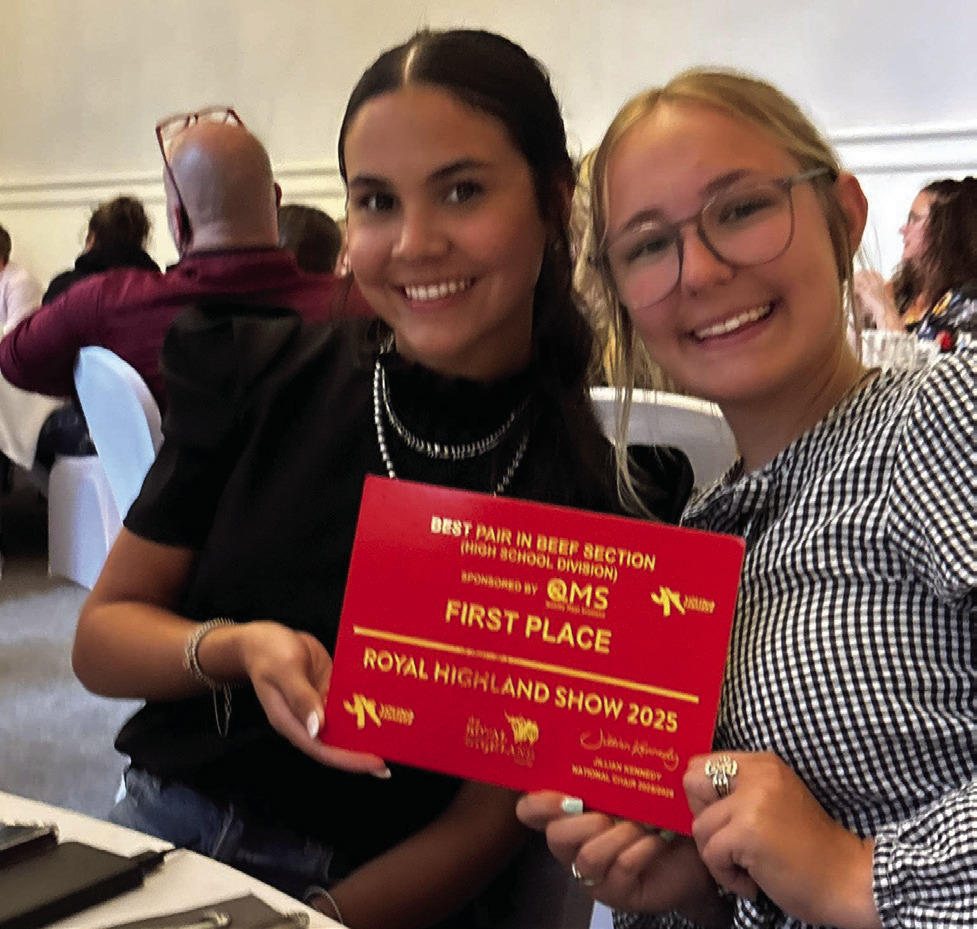 Percy Torrez and Jackie Finney show their First Place livestock judging certificate at the Royal Highland Show award ceremony