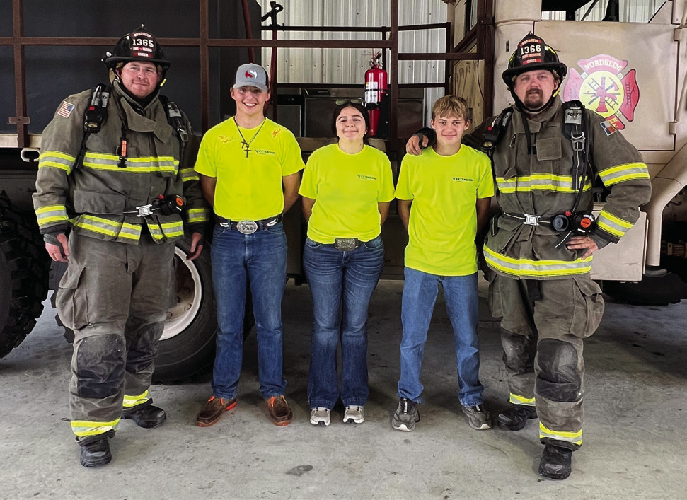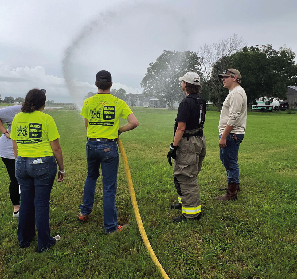 All three recently shared their camp stories, wearing their day-glow yellow camp shirts, at the Nordheim VFD meeting room. Later that evening, they set up a smoke rescue course and hose training for the adult firefighters to practice.
