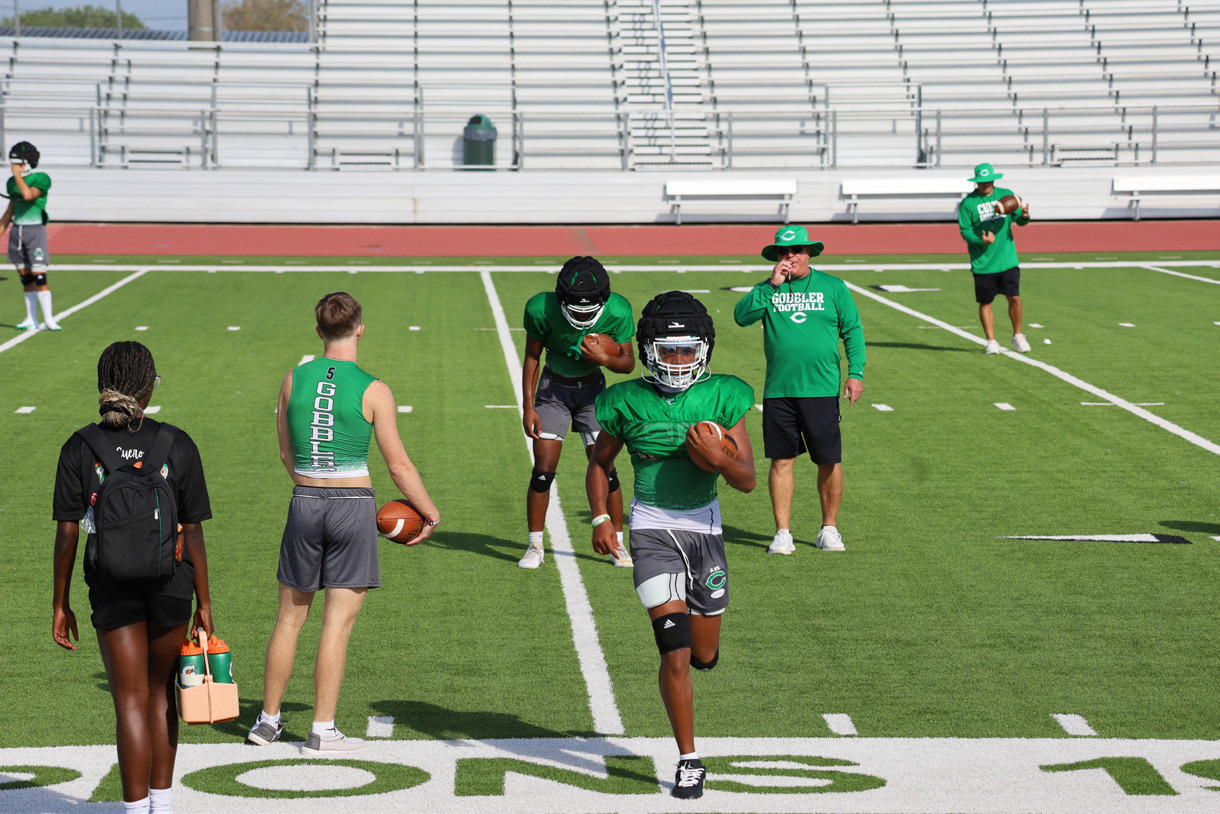 Gobbler fans show up with umbrellas for shade at Saturday’s practice and scrimmage. Earlier in the morning, the football teams gathered in full uniform for team photos before the August heat kicked in. Watch our Facebook page for the fall poster arrival.