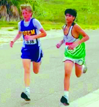 Elias Gomez runs neck and neck with a participant from Odem in Port Aransas. Gomez finished the race in 2nd place with a time of 13:09. Photo by Brian Gomez
