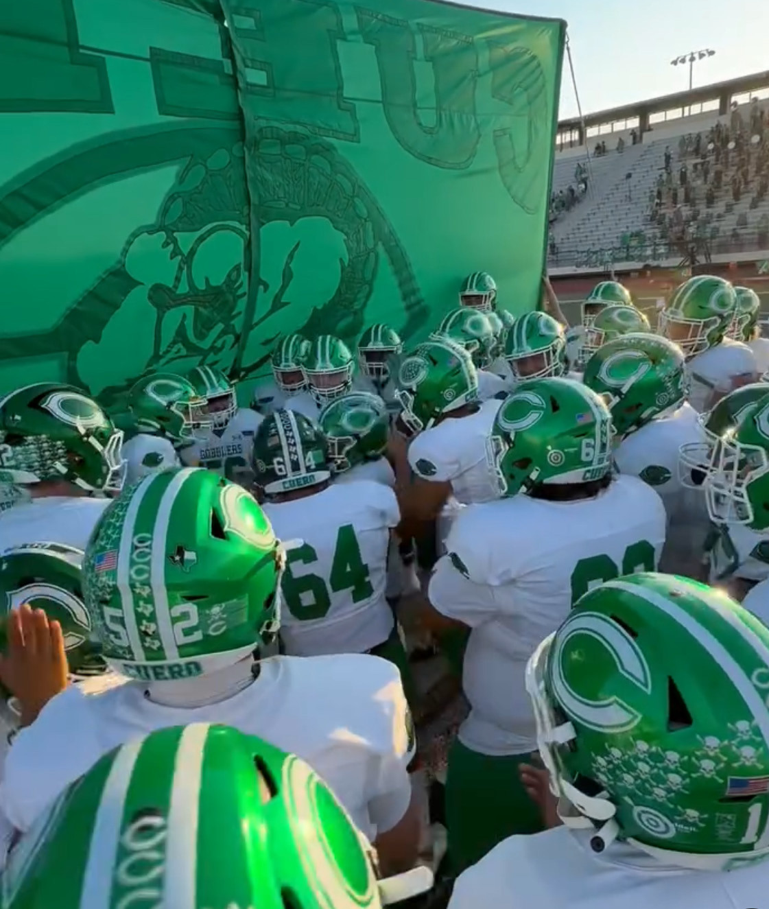 Varsity Gobblers prepare to run out on the field to take on the Corpus Christi Miller Buccaneers at Friday’s non-district match up. Photo by Rachel Brown