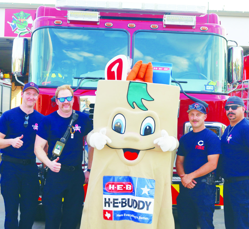 Cuero firefighters Clint Morris, Justin Adcock, Dillon Barrow, and Micheal Renteria, take a moment to pose with HEB Buddy. Photos by Myranda Trentman-Shaffer