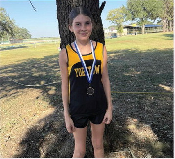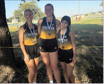 In one last tune-up for their District meet on Wednesday, the Yorktown Cross Country runners participated in The Sacred Heart Hallettsville Invitational Cross Country Meet. In the girls varsity division, (left to right) Rylie Krueger placed 4th, Carly Weischwill placed 17th and Serena Villarreal placed 18th. In the junior high girls division, Ginger Mungia placed 11th. Photos by Val Acree