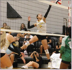 Russell kept the momentum going with a diving hustle play that resulted in another kill, extending the lead to 11–5. Carsyn Brown added an ace for 13–6. After a few unforced errors by Bloomington, the Kitty Kats capitalizedwithadigfrom Brown, a set by Palyn Koopmann,andanoutside kill from Paige DeLeon. With Koopmann serving, Yorktown continued to pull away. Russell recorded another ace for 20– 13, and Evelyn Merks added an ace for point 24. On game point, DeLeon made a crucial dig that led to a setter push for the final point, closing the first set 25–14.