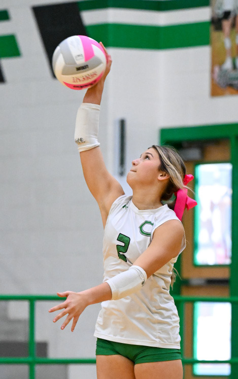 Ashlyn Gamez serves the ball in the Lady Gobblers ‘ victorious game against San Antonio Kennedy. Courtesy Photo
