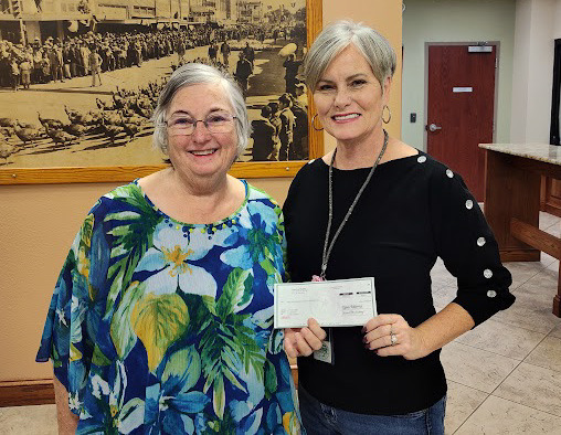 DeWitt County Historical Commission member Barbara Nuckels presents a check to Connie Hawes for the Cuero Public Library’s ancestry.com renewal for one year. Photo by Larry Nuckels