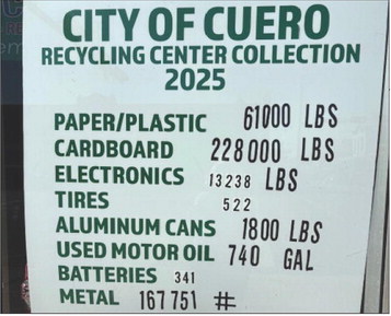KCB, an affiliate of Keep Texas Beautiful and Keep America Beautiful, celebrates America Recycles Day, Nov 15, by decorating a storefront window at Esplanade and W Main St. ( Cuero Chamber’s new building) recognizing the volume of materials collected in 2025 at City’s Recycling Center. The numbers do not include what residents and commercial properties recycle through TDS twice monthly. KCB commends Cuero residents for their commitment to preserving our environment and conserving our resources for the future.