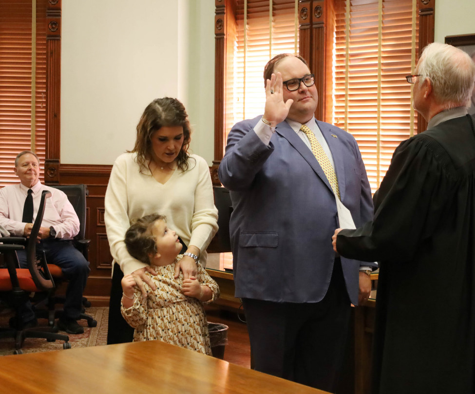 • Brian Cromeens, the new 24th Judicial District Attorney, takes the oath of office on Jan. 1 accompanied by his wife, Maggie, and daughter Libby. District Judge Stephen Williams administered the oath.