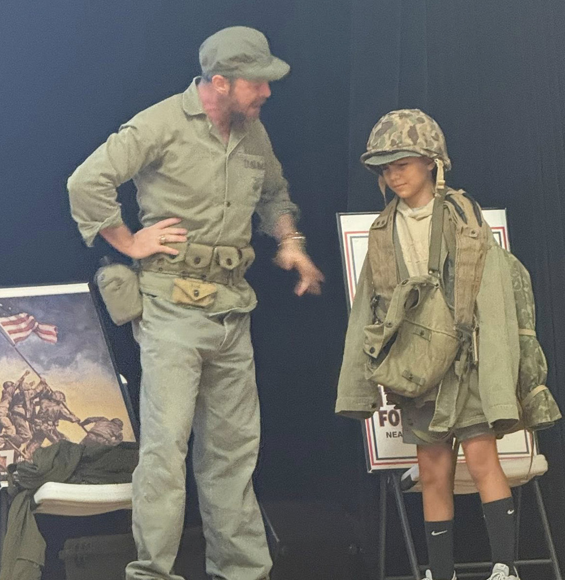 Fifth-grader Adrian Ybarra said, “I thought it was cool. I learned that one of the Marines who raised the United States flag at Iwo Jima was from Yorktown. It was also an honor to wear the uniform, and it felt like I was a real Marine back in 1941. I also really liked the boxed radio and acting like a Marine.”