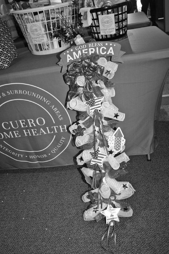 According to the Tex- Jay Babcock (L) and Cory Smith (R) hold raffle baskets at the Cuero Home Health office, 613 Esplanade. Proceeds from the ongoing raffle will help homebound patients with extra necessities during the Christmas holidays. Tickets can be purchased for $5 at the office during business hours with ongoing drawings for winners. Each season new lighted door hangers are included as prizes.