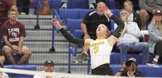 The Kitty Kats scored during set three with a solo block by Stehling, 1-2. Krueger killed the ball out of serve receive, bringing Person back to serve. A hitting error by their opponent tied the set, 4-4. Yorktown hit out of bounds to give the ball back to Flatonia but Martin killed on the following play. Stehling served and Flatonia had an unforced error giving the Kitty Kats their first lead of the match, 6-7. Stehling aced to extend the lead before the Bulldogs scored off a hit. Back to back hitting errors forced Flatonia to call timeout, 9-6. After leading 14-10 unforced errors allowed the Bulldogs back in the match and a timeout was called with the set tied, 1414. Krueger nailed a line shot to score, giving possession back to Yorktown, 15-14. Stehling aced tying the set, 17-17. Tip kill by Weischwill, 20-21. Person scored from left side, 21-22. Person scored again but this time with a push that dropped, 22-23. Down 22-24, Yorktown called time and iced the server, 2324. Flatonia ended the match, 23-25.