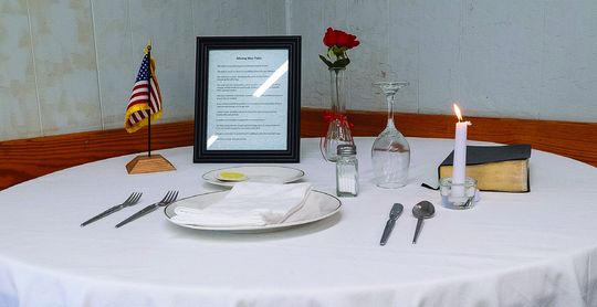 “The Missing Man Table Ceremony” with the empty chair was very poignant, set with a white tablecloth, a single candle, the Bible, an inverted glass, and a single red rose in a vase, around which was tied a red ribbon.
