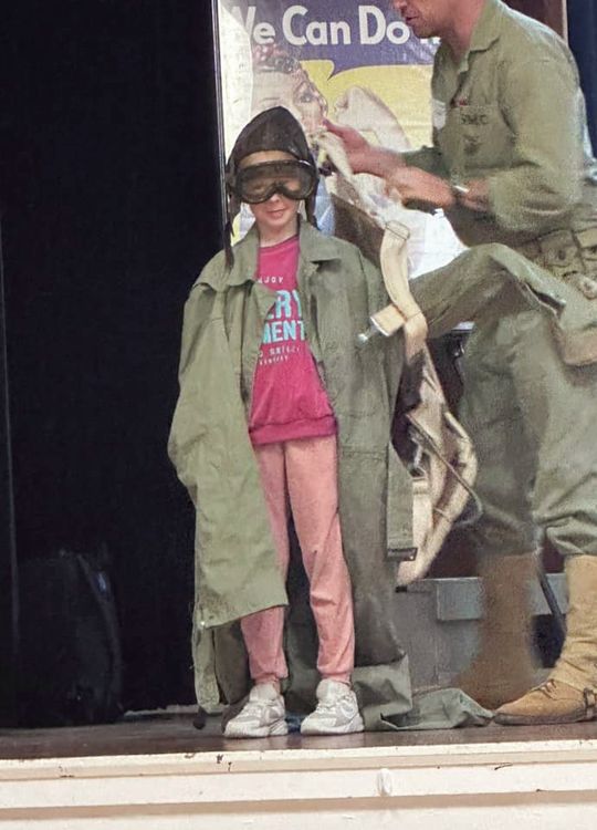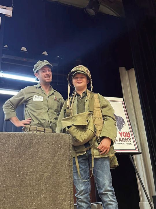 On December 11, Darby Cheek and Jared Van Auken, two members of the educational outreach department from the National Museum of the Pacific War, located in Fredericksburg, Texas, visited Yorktown ISD. 4th-12th graders were given a presentation by Mr. Cheek on World War II in the auditorium. He went into great detail on the causes of World War II and especially focused on the war in the Pacific. He also displayed many World War II artifacts! Mr. Cheek also dressed up some of the Yorktown students in World War II gear. 4th grader Adelaine Gowens put on a Women Airforce Service Pilot (WAS) uniform and 7th grader Haeden Edmondson put on all the gear a Marine would have worn in battle.
