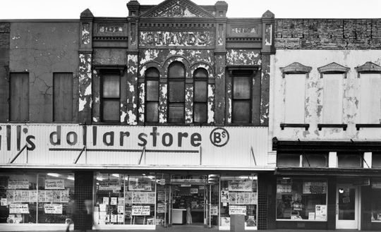 In 1907, it was expanded to the three-bay storefront and had various commercial uses in front and back. In the 1940s, the second story of one of the interior spaces was removed to become a movie theater, called The Trot. Later the building became a dollar store.