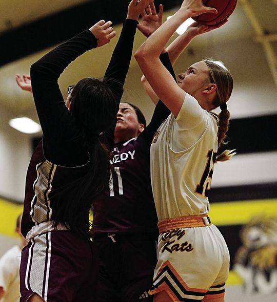 Inclement weather pushed Yorktown’s January 20 home game against Kenedy to Monday, but the rescheduling didn’t deter the intensity. In a nail-biter, the Kitty Kats fell 50-49 to the Leopards. Senior Nina Villarreal led the charge with 17 points, while Stehling added 12 points and nine rebounds. Boyd’s all-around effort in-cluded 10 points, seven rebounds, and five steals, with freshman Palyn Koopman contributing eight points and six boards.